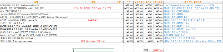 하지만 어떤 재료가 필요한지 자세히 모르고 라이다 센서 같은 경우 소프트웨어 프로그램조차 모르기에 생각이 많았다